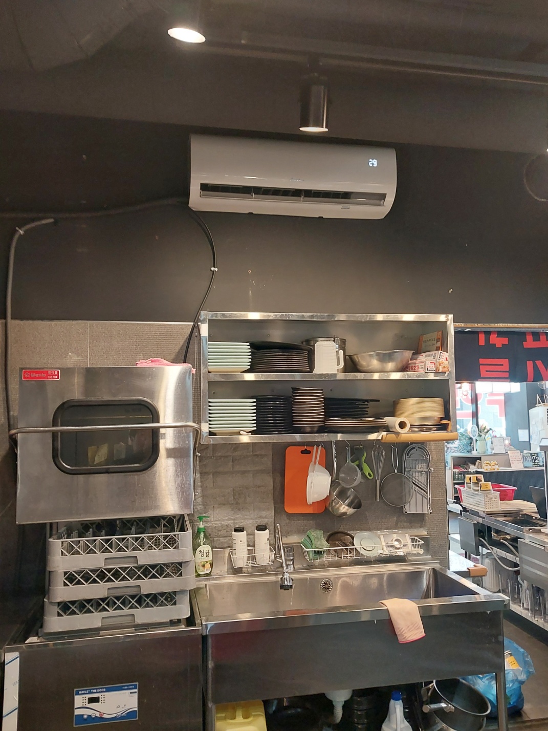 베이케어는 현장을 꼼꼼히 점검한 뒤, 여러 요소를 고려해 냉난방기 위치를 새롭게 선정했습니다. 먼저 화구에서 충분히 떨어진 높은 벽면에 설치하여 열기의 영향을 최소화했고, 흡입구 방향을 조정해 기름 연기가 직접 닿지 않도록 했습니다. 배수 호스는 경사를 안정적으로 확보하면서 주방 동선을 방해하지 않도록 배치했으며, 배관은 벽면과 천장 내부를 최대한 활용해 노출을 최소화했습니다.